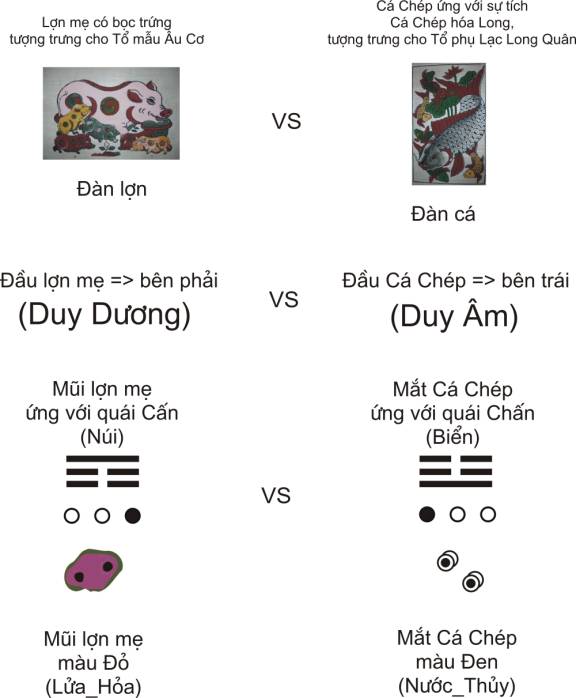 Vậy thì bức tranh cá chép với cái đầu cá có đôi mắt đen (Thủy – nước) quay về bên trái (duy Âm) chính là hình ảnh tượng trưng cho Tổ phụ Lạc Long Quân, còn 50 người con theo cha xuống biển được tượng trưng bằng 5 cá con. Thật là quá chuẩn và chỉnh còn gì!?