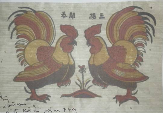 Trong tranh Đông Hồ cũng có một bức tranh vẽ hình mặt trời tỏa sáng, đó là bức tranh Chọi gà. Đây là một bức tranh có bố cục hài hòa và rất cân xứng, thể hiện bằng hình ảnh hai con gà trống đang trong tư thế đối chọi nhau. Bạn có thấy hình mặt trời vẽ cách điệu cho phần cánh của gà và những chiếc lông tỏa ra xung quanh không. Nó giống như một hình tròn bị che lấp đi một nửa vậy. Nhìn kỹ sẽ thấy phần mặt trời ló rạng có hình tương tự như hình cong lưỡi liềm nhưng ở dưới thì to còn ở trên thì thon nhọn. Hình ảnh này có nhiều điểm tương đồng với hình nòng nọc uốn cong hơn là hình lưỡi liềm hay hình trăng khuyết.