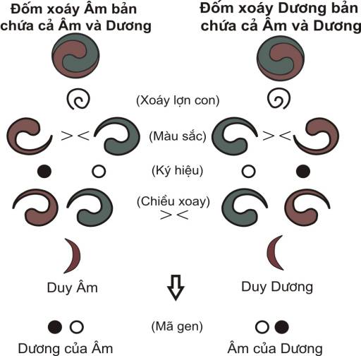 Đốm xoáy Dương bản có cả Âm O và Dương ●, nhưng vì hình đầu lợn mẹ quay về bên phải (duy Dương) nên gen của nó mang Dương tính nhiều hơn và có mã gen là O● tức Âm của Dương hay Thiếu Dương. Tương tự đốm xoáy Âm bản có mã gen là ●O tức Dương của Âm hay Thiếu Ấm.